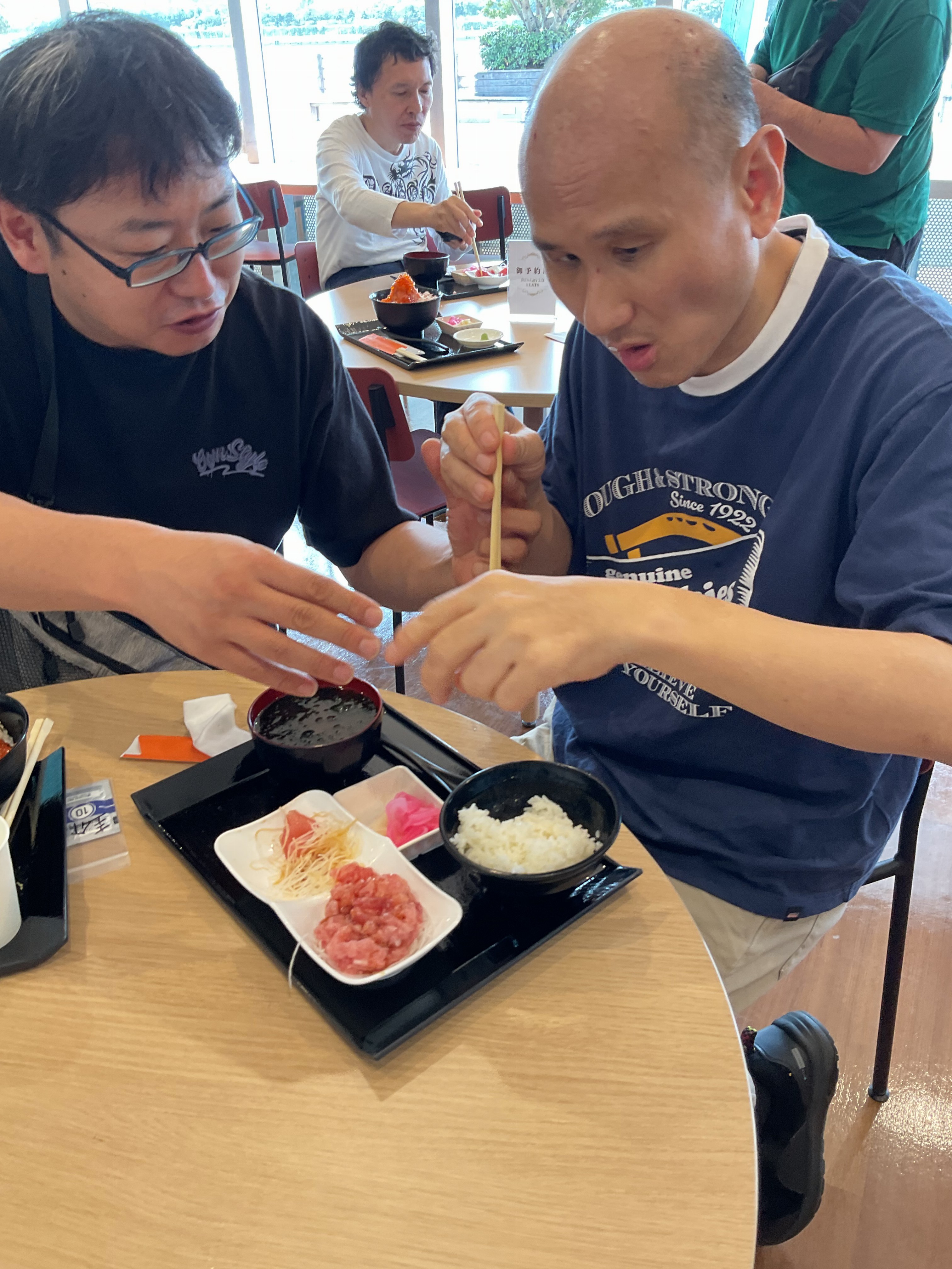 現地に着き、お腹も空いていたタイミングでさっそくお楽しみの昼食を摂り、ボリューミーな海鮮丼や豚丼などをそれぞれ堪能しました。